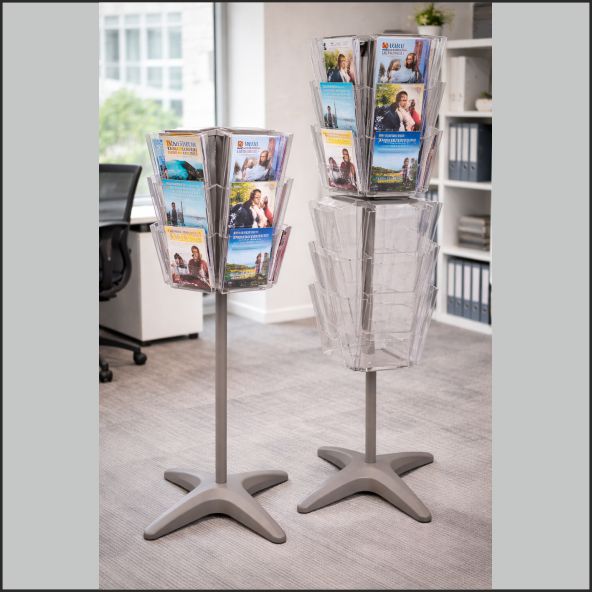Stalak za prospekte Karusel idealno je rješenje za uredske prostore, čekaonice, sajmove i prodajna mjesta gdje želite jasno i pregledno prezentirati svoje promotivne materijale.