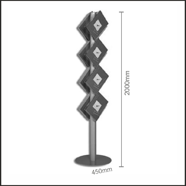 Stalak za prospekte Promo Tondo predstavlja samostojeće i iznimno stabilno rješenje za izlaganje prospekata, letaka i brošura u poslovnim prostorima, trgovinama, izložbenim prostorima i info-zonama.