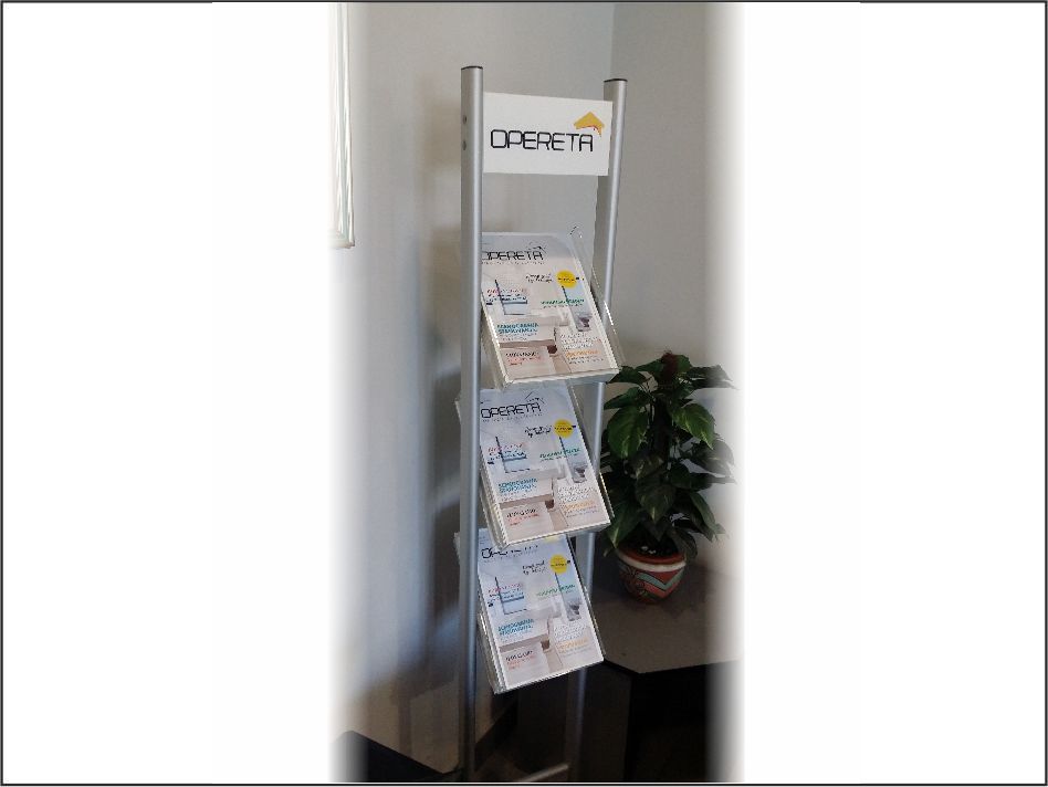 Samostojeći stalak za prospekte, letke, brošure dizajniran sa istaknutom logo pločom.