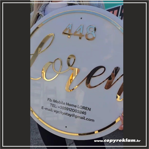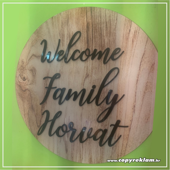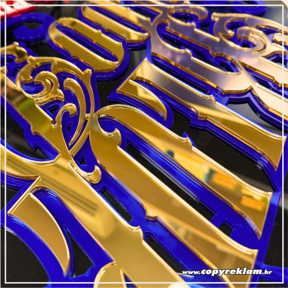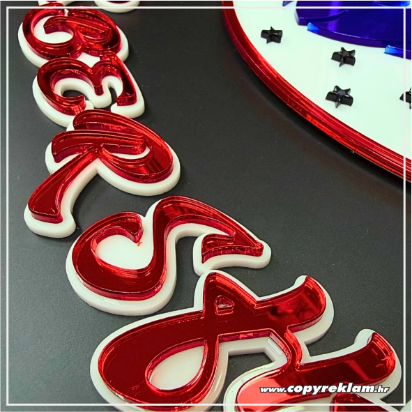 Sastavljamo ju iz dva sloja pleksiglasa: izrezujemo vaš logotip, znak i/ili tekst iz jedne vrste pleksiglasa i pričvršćujemo na pozadinski pleksiglas krug.